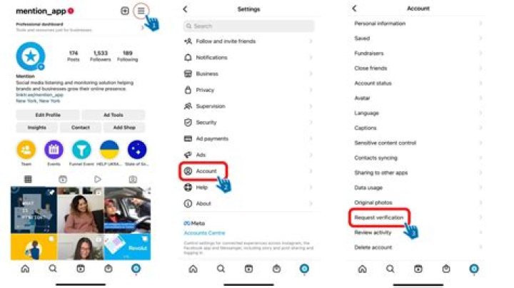 Tap or your profile picture in the bottom right to go to your profile. Tap in the top right, then tap Settings. Tap Account, then tap Request verification...