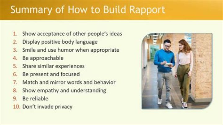 Ways to genuinely build rapport with your employees 1Share your failures. 2Talk beyond work. 3Practice active listening. 4Be genuine. 5Use recognition. 6D...